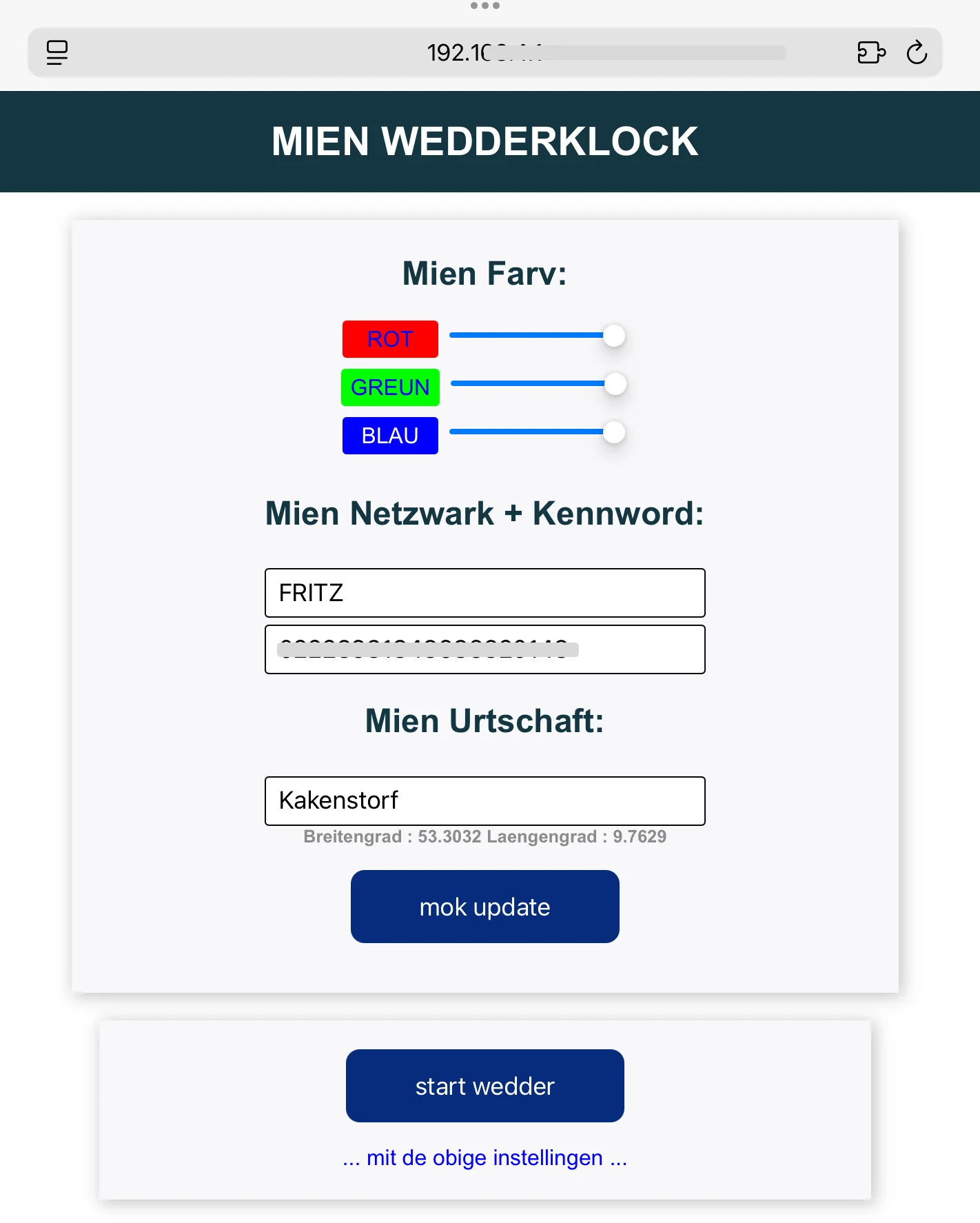 Nach dem KLICK auf "START KLOCK" durchläuft die STATION eine Start Sequenz. Dabei läuft im Vordergrund ein "Wetter-Countdown". Im Hintergrund baut die Station die Verbindung zum Internet und DEM Zeit- bzw. Wetter-Server auf.